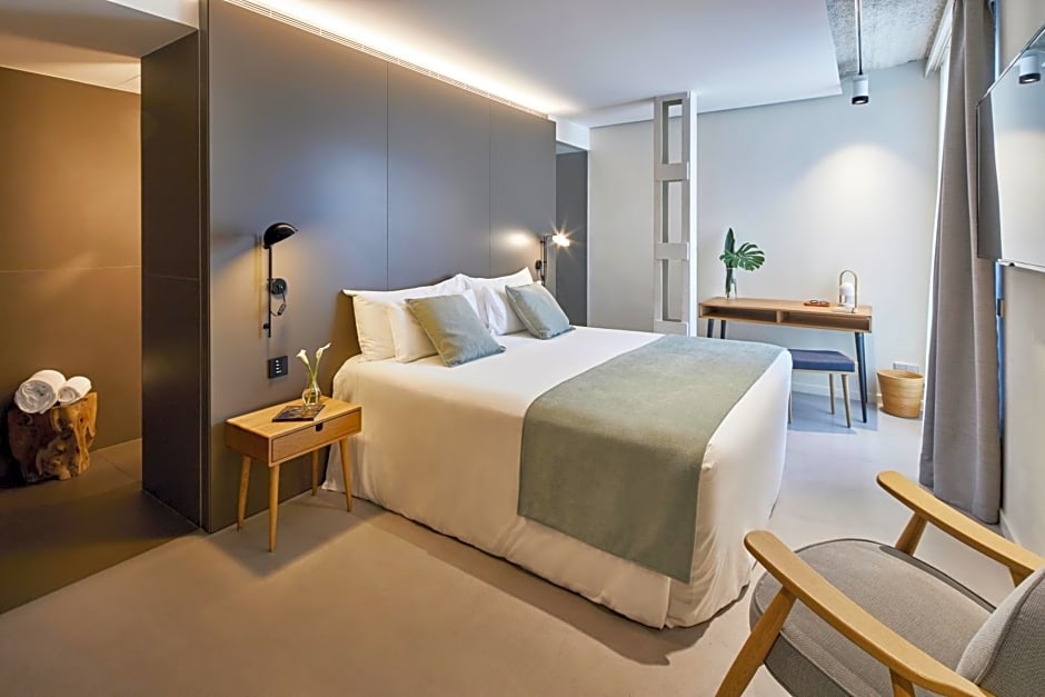 Featuring industrial decor, unique furniture and ceramic walls, this room has views of Calle Corcega. There is a see-through rainfall shower visible from the bed.